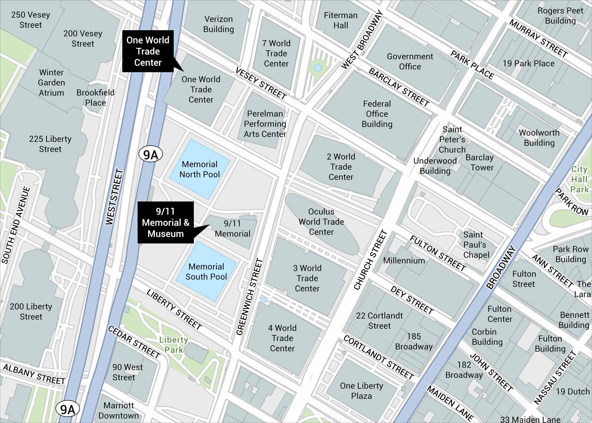 Our map of the World Trade Center marks the old and new sites of the World Trade Center. You’ll be able to find the North and South Memorial Pools, One World Trade Center, and the 9/11 Memorial & Museum. From north to south, you can see how the landmarks fit together on the ground. It’s a place of memory, history, and resilience.