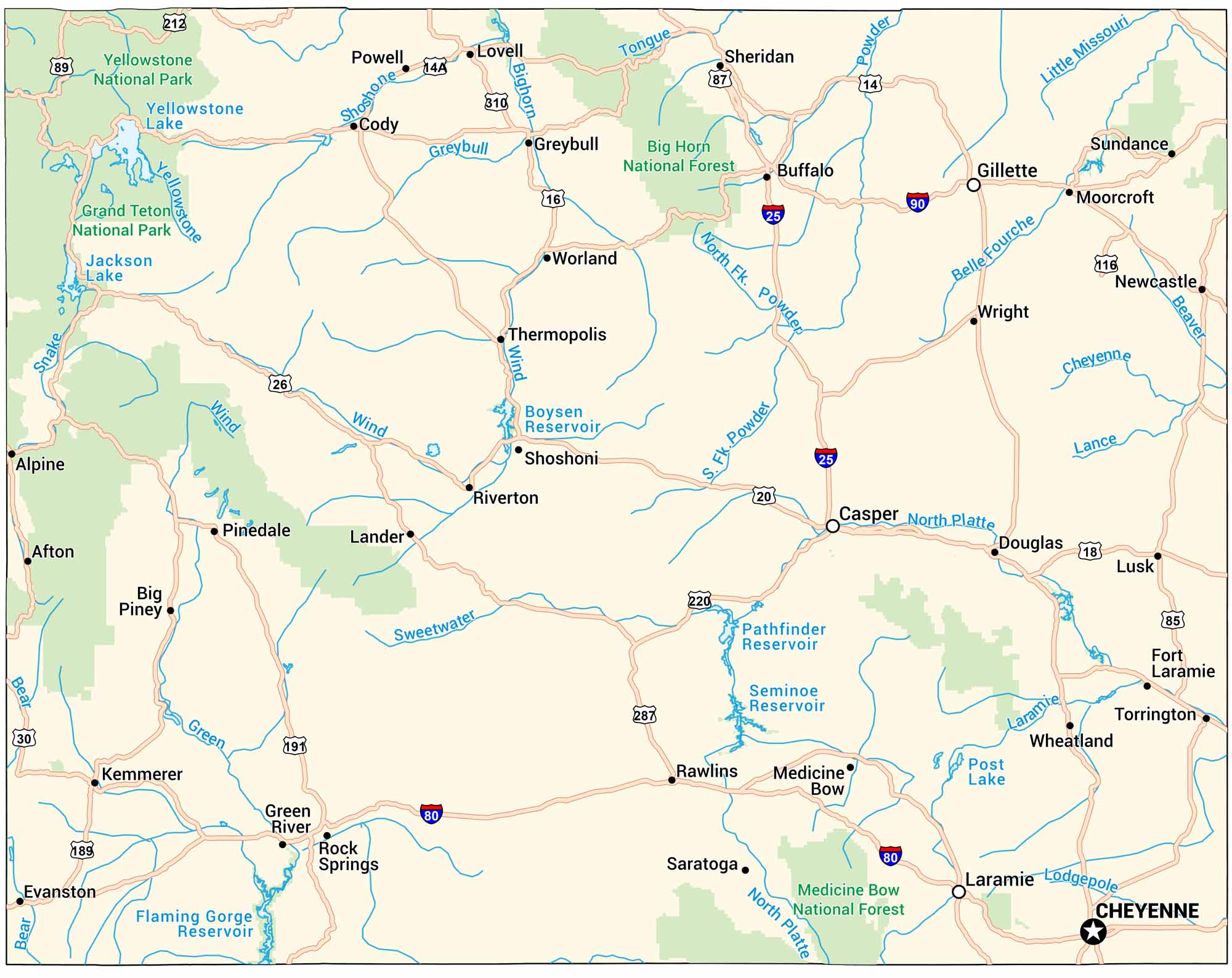Our map of Wyoming shows highways, rivers, and lakes across the state. Yellowstone National Park sits in the northwest, surrounded by mountains and wide plains. The rest is mostly open country stretching for miles.