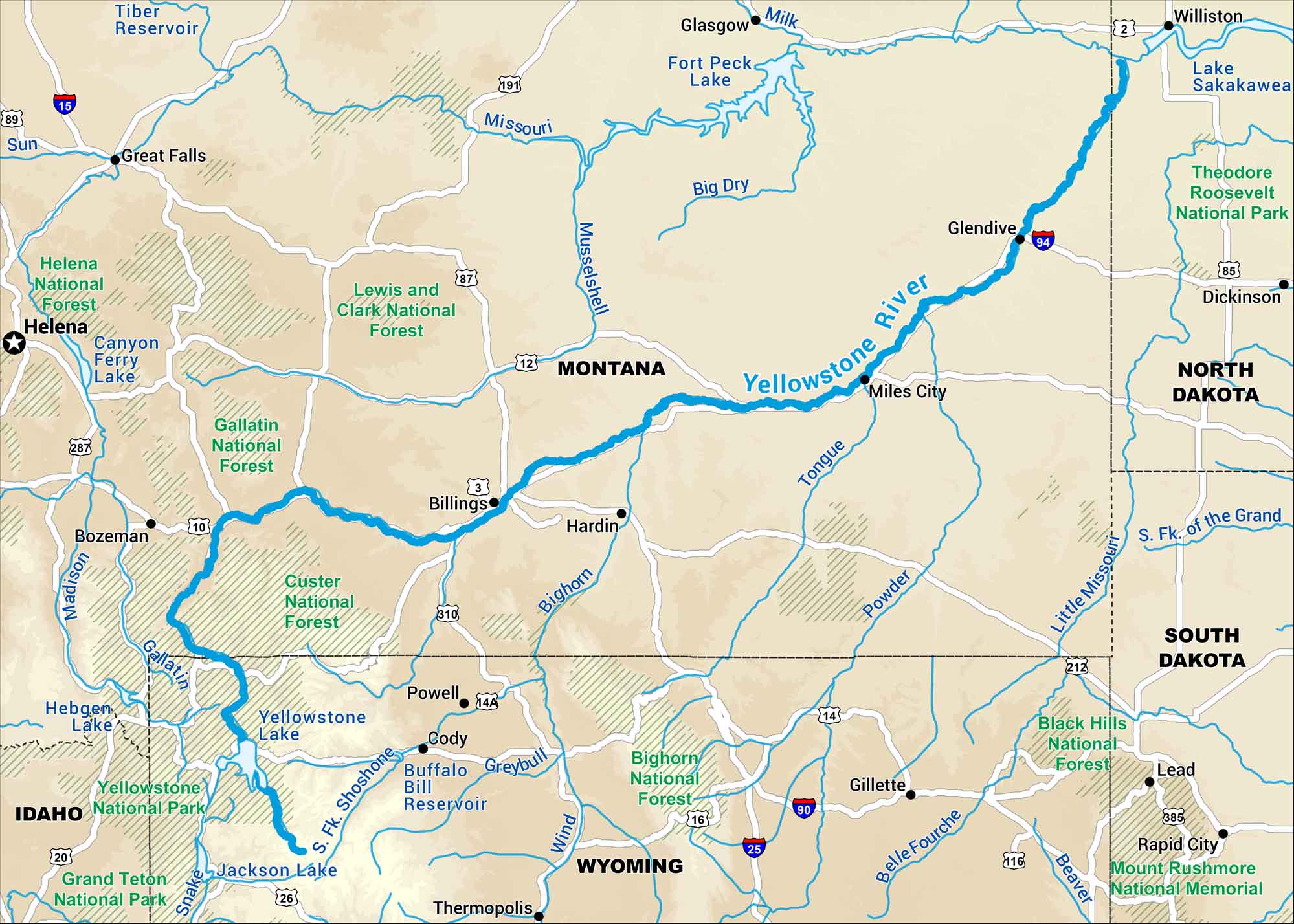 Here’s our map of the Yellowstone River running across southern Montana. It’s one of the last free-flowing rivers in the West, stretching from Yellowstone National Park through wide open plains. Along the way, it passes cities like Billings, Glendive and Miles City.